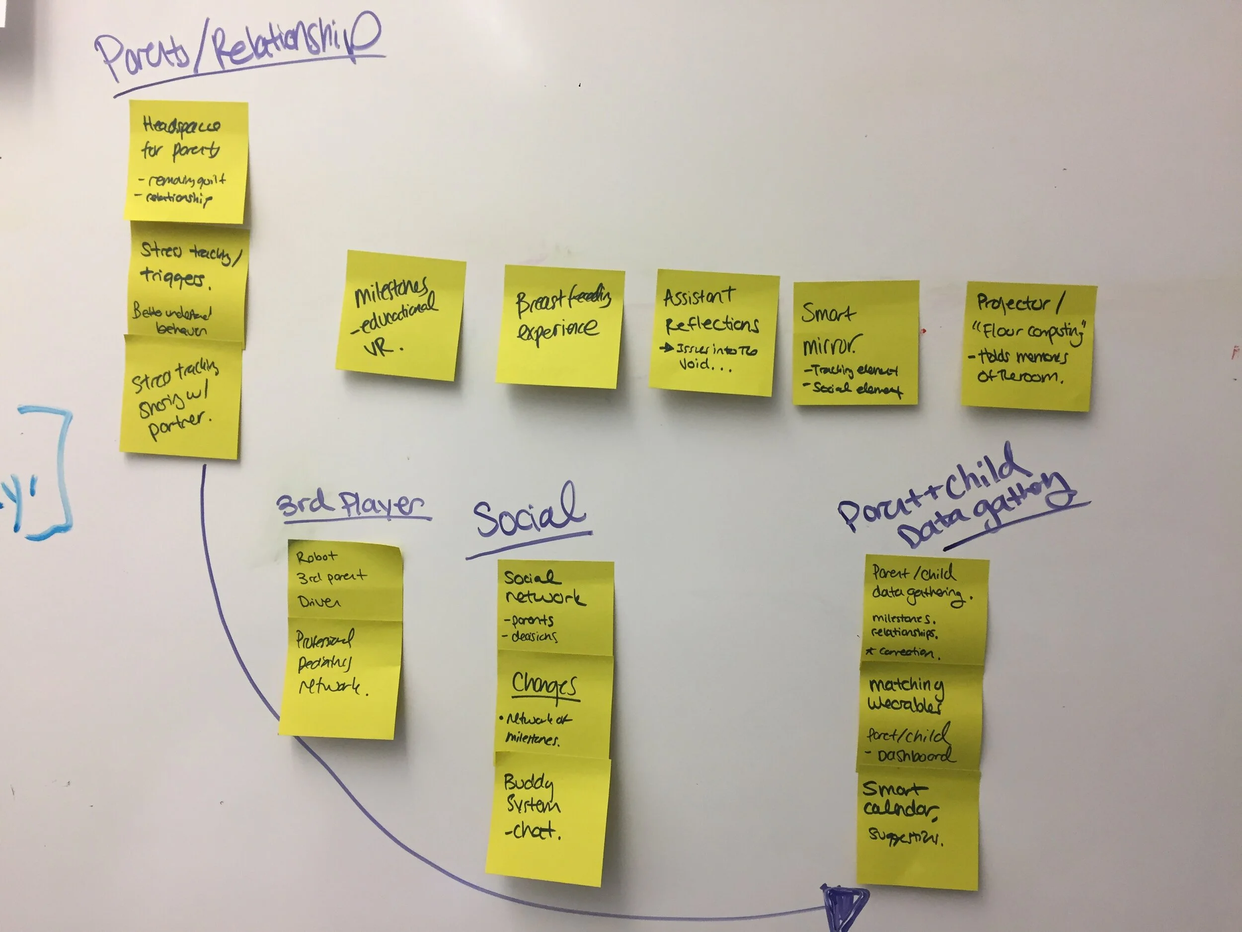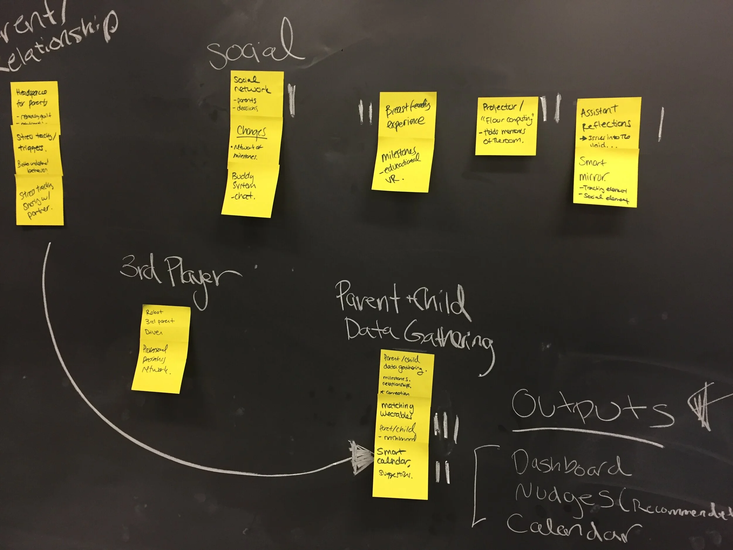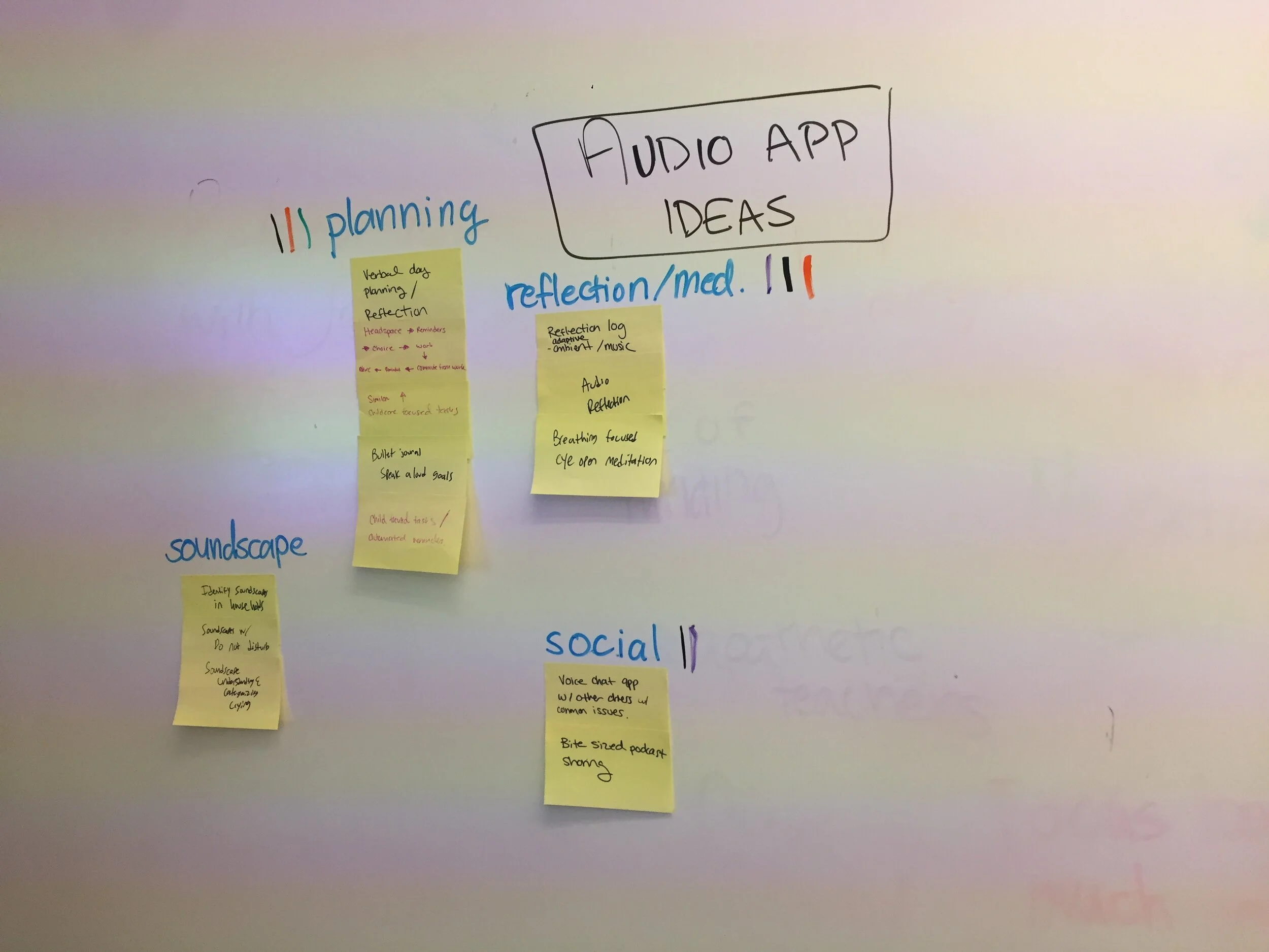 After converging on an audio driven application to be used primarily during a user’s commute to help parents talk through issues they may be having. We took to low-fi ideating what a system like that may look like. We invested heavily in scrappy voice design. We later decided on integrating a mobile interface as a companion application to help parents look deeper into patterns in their dialogue and help them develop their own insights.